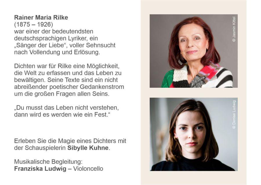 "Die Weise von Liebe und Tod des Cornets Christoph Rilke" – Melodram Außergewöhnliche Erlebnis-Literatur in einem faszinierenden Wortkonzert. Interpreten: Schauspielerin Sibylle Kuhne und Tommaso Graiff am Flügel Ort: Ariowitsch-Haus,